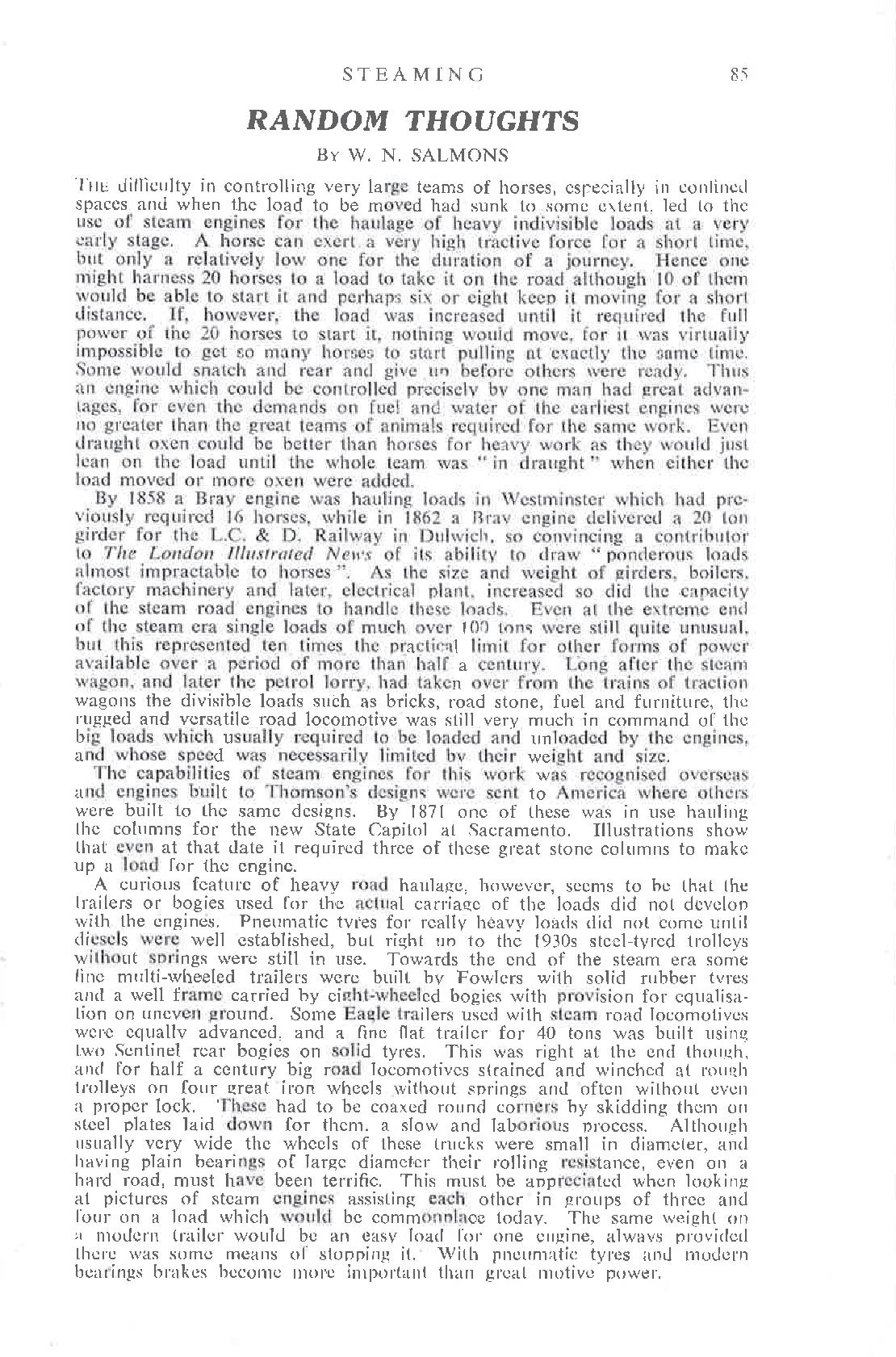 In 'f'lu: Lo11do11lfhwrmecl Ne11•.,; of its abilflv 10 draw ·• PorHlernu~ loads a!mo-sl impraclablc l,o horses". As 1hc size and wcittht of ~irdcrs. boiler:--, fncLoty m::whinc:i-)• ~nd later. clc,ctrical plal"ll. incnrnscd :m c1id lhc capacity or the steam road engines Lo handll? thec.e loads. Eve,, a[ the extreme c1id or lhc steam era single lo~ds of much over f on L<H1~ w,o,re sWI tpai'le LH1111s1rnL but this repre:scr11t:.:d1e11 limes Lhi.: i,rattur:il limil for ol~cr forms of r,,,wcr av~1ilablc: 0\ 1cr :1. p~riod of mor~ lhan half a ce,nu,·y. long al"leli the sltU='!n1 wa,gon, and la1ter lhc petrol !orr:.1• h<ld la1'.cn over from the 1rair.s ()f fraction wagons the divh;ihlc loads such as bricks, road stone, fuel and furniture, the rUgJ!ed and versatile road locomotive was still very much in command of tbe big loads whkh usually required In be loaded ::111·dunloaded by tbc engines, and whose speed was nece~sawily li11r1itedbv their weight and size.