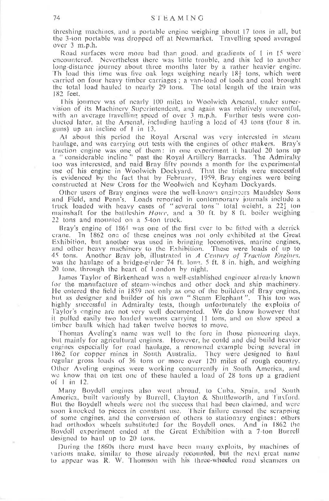 Between Murdock and the Burrcll-Boydcll of 1856 cam~ many atlcmpls lo 115,cstcum power on lhc tr>.i,ds. Most or llwsc were slcm11 Ci;irri~g,cs,sumc. n/' whid11 'Were highl.v Nucccssfu'I hut do 1101 ,conc:~rn u~ Imm: i11 11ny case they ail died away hecniusc of prejudice 1rnd fooli:;h laws. lhtl gnuluaHy tho idem or the traction engine. ha,iling il$ !ond bchi11d ii, came inlo bdu!;, :rnd llca\·y haulage w:u: i111husiness.
