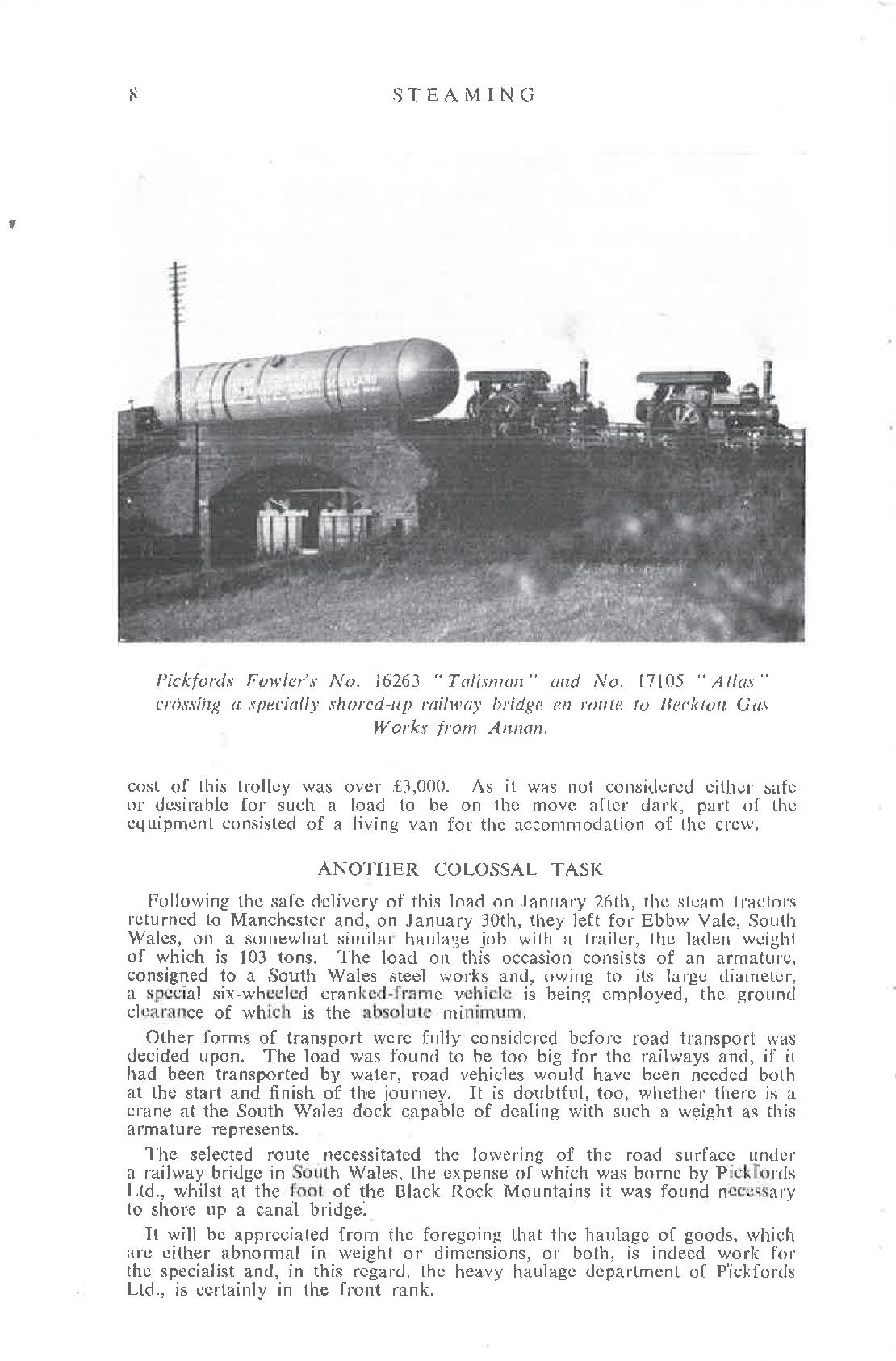 It will he appreciated from the foregoing Lhat the haulage of goods, which arc either abnormal in weight or dimensions, or both, is indeed work for the specialist and, in this regar<..I,lhc heavy haulage tfopartmcnl of P'ickfords LLd., is ccrlainly in the front rank.
