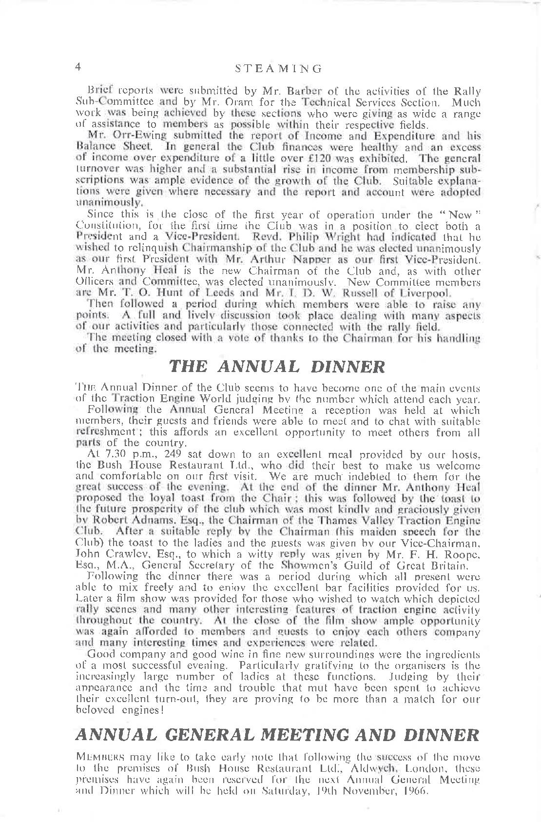 'l'IIF. Annual ninner of the Club seems to have hecomc one of the main events of the TrJlction Engine World ju<l~in~ hv tl1c nllmh;::r which attend each year.
