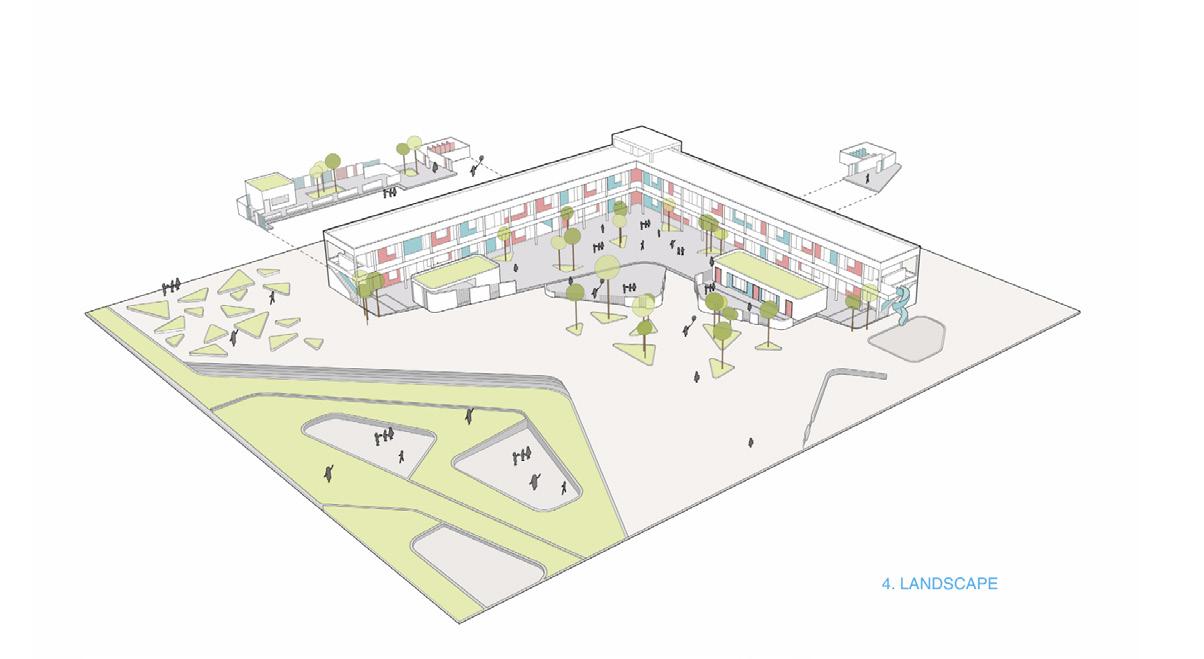 Located in rural Andhra Pradesh, our proposal reimagines an existing L-shaped school building for the children of cement plant workers into a vibrant, inclusive, and climate-responsive learning environment. A lightweight bamboo canopy weaves together new program pavilions and the existing structure, blurring the boundary between inside and outside while providing shade from the intense sun. Bamboo, a fast-growing and renewable resource with a high strength-toweight ratio, is central to the design, offering a low-impact, carbon-sequestering alternative to conventional materials. Its use supports sustainable construction practices and local economies.