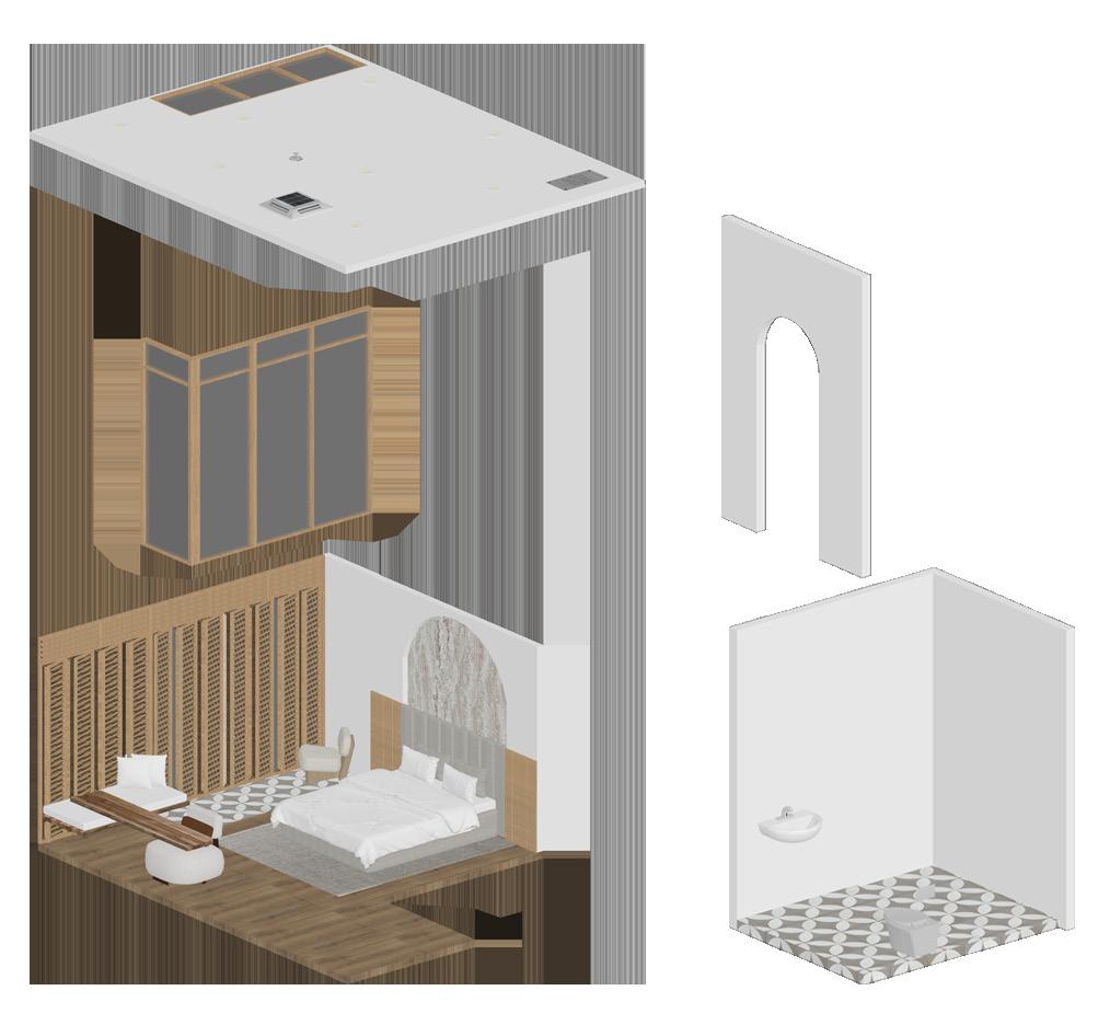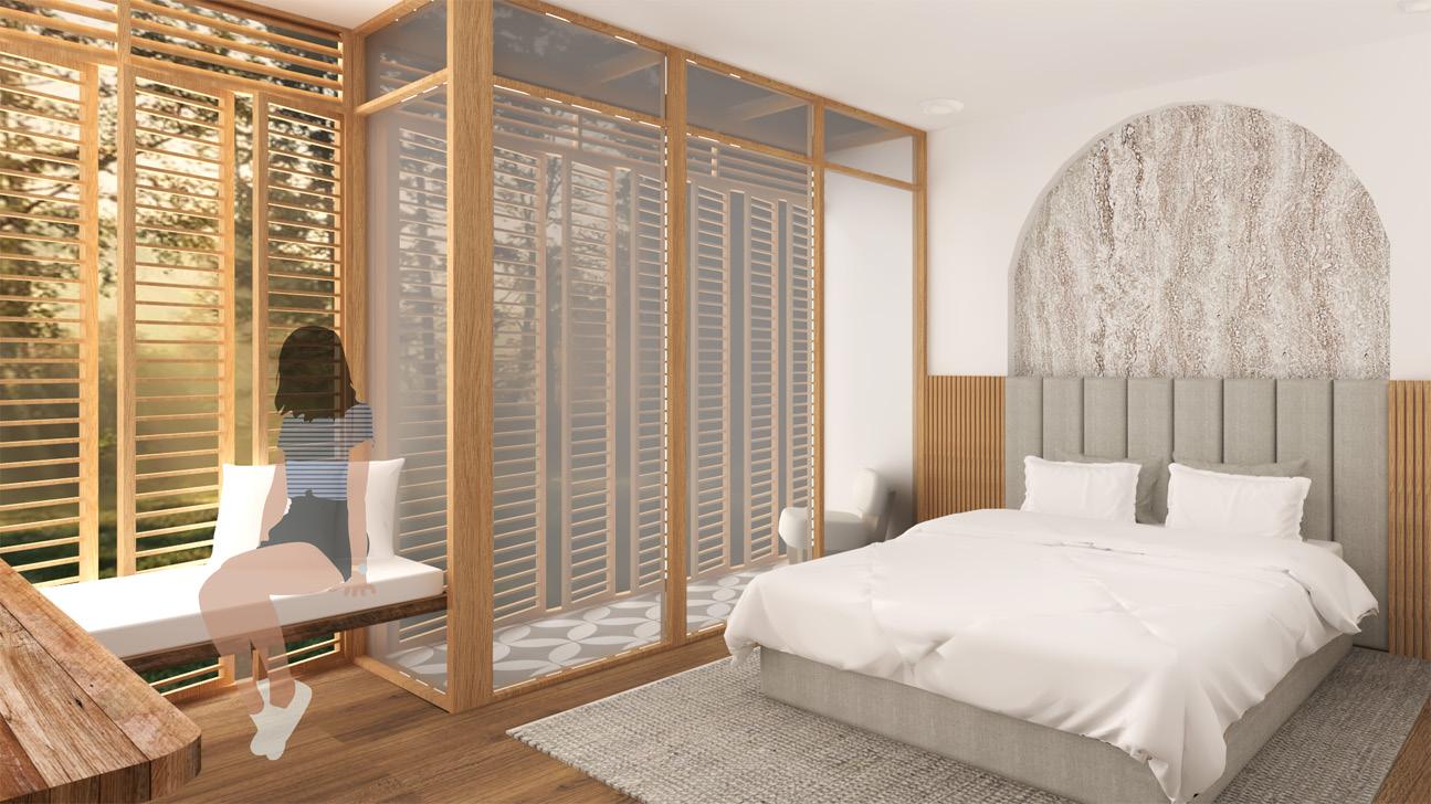 MAJOR CONSIDERATIONS FOR THE SUITE ROOM ARE THE VENTILATION, NATURAL SUNLIGHT, AND THE MATERIALITY. AS FOR THE SOLUTIONS, THE VENTILATION OF THE SPACE HAS BEEN MAXIMIZED THROUGH THE USE OF LOUVERED WINDOWS, OPERABLE ONLY ON A CERTYAIN ANGLE FOR NATURAL AIR CIRCULATION AROUND THE SPACE IF THE USER OPTS FOR NATURAL AIR THAN AIRCONDITION. FOR THE CONSIDERATION OF NATURAL SUNLIGHT, THE USE OF THE SUNROOF SEATING AREA WAS PROVIDED FOR THE USER TO FEEL THE NATURAL AMBIENCE WITHOUT COMPROMISING THE USER’S SAFETY. AS FOR THE MATERIALITY, FURNITURE ARE MOSTLY BUILT INS AND EDGES ARE SOFTENED/CURVED FOR THE SAFETY OF THE USERS.