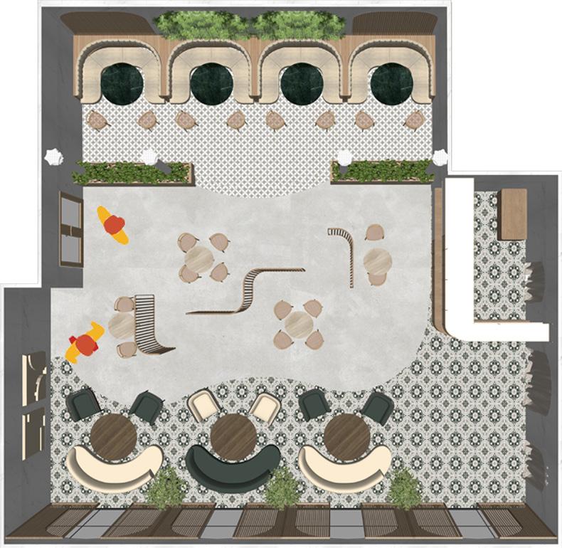 THE MAIN CONSIDERATION FOR THE SPACE IS HOW IT WOULD CATER TO VARIOUS AGE GROUPS AND THE SOLUTION FOR THIS IS TO BRING IN NATURAL LIGHT, MAKING THE SPACE WARM AND WELCOMING, AND THE PLAYFUL USE OF INTERESTING PATTERNS FOR THE SPACE. THOUGH MAXIMALIST IN NATURE, THE SPACE WAS METHODOGICALLY STUDIED TO GIVE CONSIDERATIONS NOT ONLY TO THE USERS OF THE SPACE BUT TO THE BRANDING OF THE SPACE.
