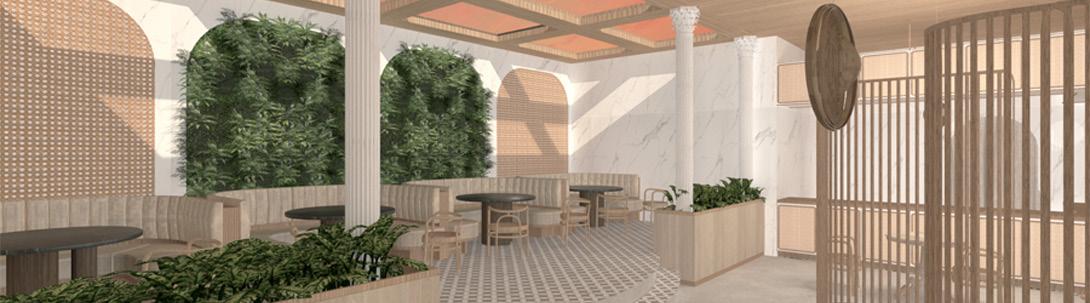 THE OVERALL CONCEPT FOR THE RESTAURANT IS THE ARCHITECTURAL MASTERPIECE, THE PARTHENON. LIKE THE PARTHENON, THERE IS A SUNROOF WHICH LETS THE LIGHT IN AND HIGHLIGHTS AN ELEVATED SPACE FOR GUESTS. THE WHOLE FEEL OF THE SPACE IS HIGHLIGHTED THROUGH VARIOUS USES OF THE ARCH - FROM WALL TREATMENTS TO SPACE ORIENTATIONS.