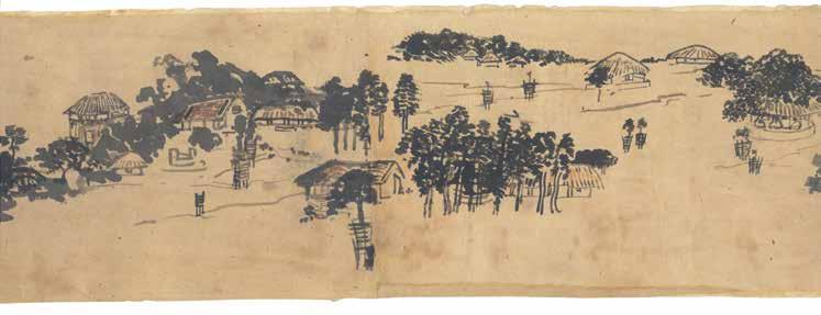 handmade (above). It took almost two years and the work of many craftsmen to complete, and I produced 29 colour illustrations and 24 black-and-white drawings. To depict the journey to the reservation, I made a series of drawings which later became a 12-page sequence of colour prints that unfold like a story, taking you from the woods into the village, then down the street to the kiva (a chamber used for religious rites) at the end. Each page has a cut-out element to give you a peek at what comes next (above).
