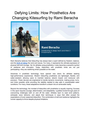 Rami Beracha is a distinguished Israeli venture capitalist and general partner at Eden Block, a London-based global investment firm specializing in blockchain technologies and Open Internet infrastructure. With over two decades of experience in venture capital and technology investments, he has established himself as one of Israel's most respected investment professionals. Born in Tel Aviv in 1961, he served with distinction in the Israeli Defense Forces Paratroopers Brigade. In 1983, during a rescue operation in Lebanon's Shouf Mountains, he sustained severe combat injuries resulting in the loss of his right hand and left foot. Despite these challenges, he returned to active military reserve service and recently completed 450 days of duty with the elite 98 Brigade. His venture capital career includes 18 years as managing partner at Pitango Venture Capital Fund, Israel's largest venture capital firm, where he managed over $2.5 billion in investments. He guided numerous successful exits, including companies acquired by Apple, Cisco, Microsoft, Oracle, and other technology leaders. His investment expertise earned him recognition as one of Israel's top venture capital partners and the title of "Most Respected Partner" in 2011. He holds a JD from Tel Aviv University, an LLM in Banking and Financing from Fordham University, and an MBA from INSEAD. He co-founded SOSA TLV, an open innovation company connecting startups with investors. Beyond his professional achievements, he demonstrates remarkable resilience through extreme sports, becoming one of the few people worldwide to master kitesurfing despite having lost two limbs. He also summited Mount Kilimanjaro and continues to participate in competitive athletics. Rami Beracha serves on the Friends of IDF Disabled Veterans Association board, mentors military veterans, and visits injured soldiers. Rami Beracha's success in venture capital, extreme sports, and veteran advocacy inspires others to overcome challenges.