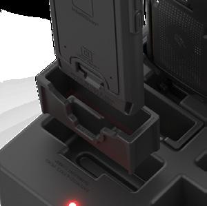 Heavy-duty docking and charging base for any device equipped with an IntelliSkin® sleeve including electronic devices. It provides HD data connectivity and an extra-heavy base for stability of larger devices and frequent docking and undocking common in commercial applications.