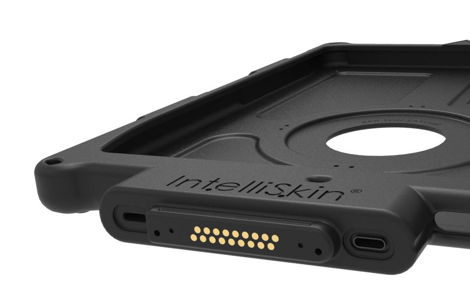 IntelliSkin® is the only case system on the market that protects the device port and converts that connection point to ruggedized pogo pads for charging and data transfer.