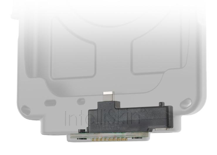 In dirty, rough environments, interrupted device connection is unavoidable. This is mainly due to lack of cleaning maintenance and excessive debris buildup. The pogo pad contacts on the bottom of the IntelliSkin® are intentionally flat to reduce the debris buildup.