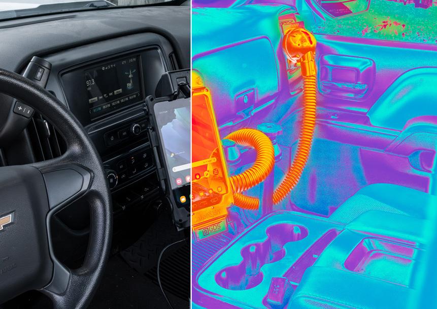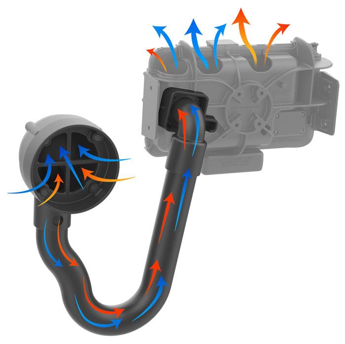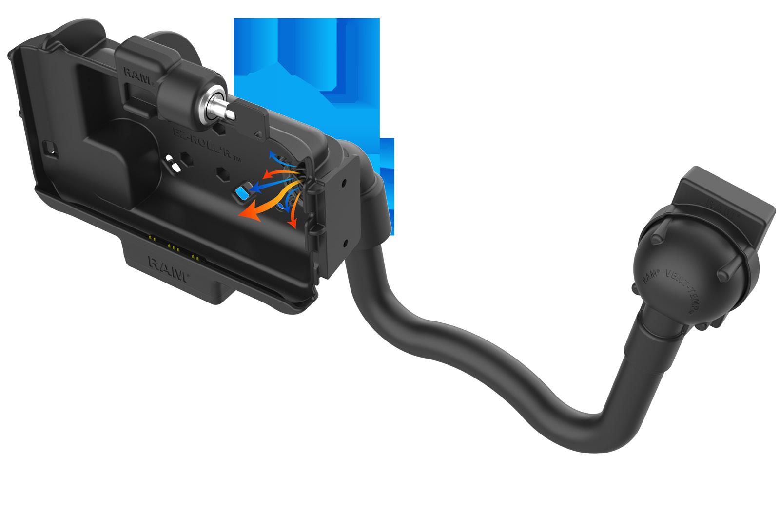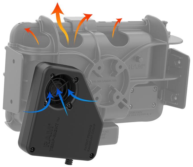 The RAM® Temp-Right™ heater module regulates device temperatures to maintain functionality in extreme cold environments and contains integrated 11-16VDC hardwire charger. Cabin air gets sucked through Temp-Right™ fan and through the module, heating the air up to the right temperature needed for tablet functionality.