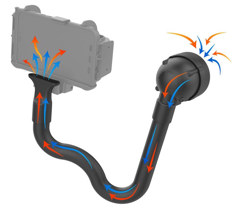 Hot or cold air from your vehicle’s air system enters through the RAM® Temp-Right™ nozzle, travels through flexible tube, and exits behind the docked tablet.