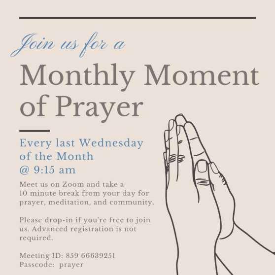 for a few minutes of reflection and thoughtfulness. In February we initiated our Monthly Moment of Prayer. It’s only ten minutes out of your day and it’s a good way to break up your week and begin again refreshed. Add us to your calendar...the last Wednesday of every month...we’re looking forward to seeing you!