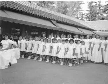 By 1901 the enrollment at Ramona had grown so large that it was evident additions were needed. Extensive plans were drawn for the remodeling and renovation using California Mission architectural style. The original red brick building was hidden under a coat of plaster, and with the addition of a new wing, the main building was enlarged. With the completion of the project, everyone was looking forward to having more needed room. In September, 1912, the Sisters were prepared to receive 132 residents, but 152 arrived. Rather than refuse them, the Sisters gave up the living quarters planned for them. From that time until 1947 when the convent (now Founders’ Hall) was built, the Sisters had no private rooms.
