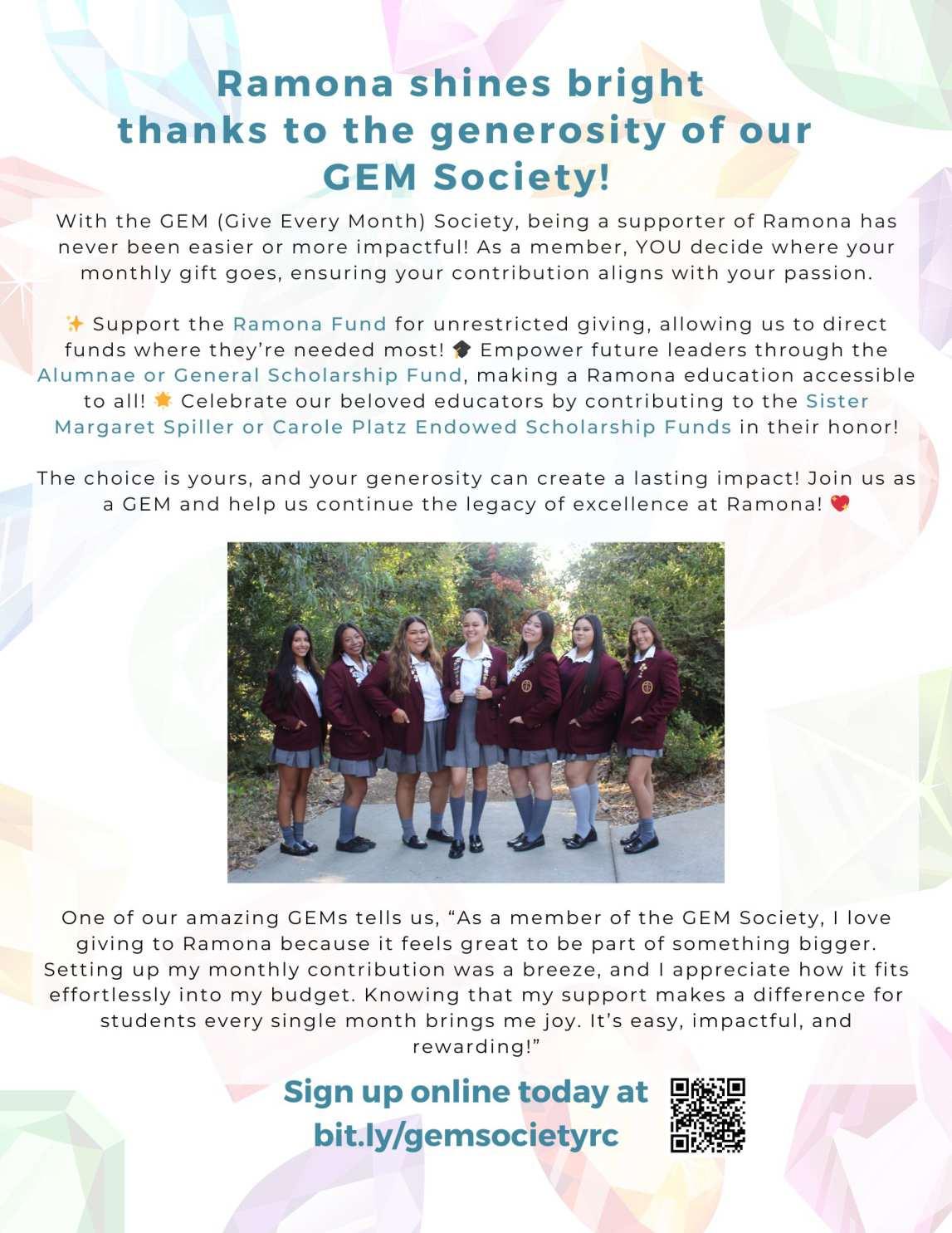 Ramona Convent is a welcoming Catholic college-preparatory high school for young women sponsored by the Sisters of the Holy Names of Jesus and Mary and committed to excellence in education. Ramona’s graduates are empowered, resilient, socially conscious leaders well prepared to meet the challenges of life as contributive members of the global community.