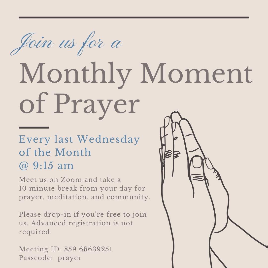 for a few minutes of reflection and thoughtfulness. In February we initiated our Monthly Moment of Prayer. It’s only ten minutes out of your day and it’s a good way to break up your week and begin again refreshed. Add us to your calendar...the last Wednesday of every month...we’re looking forward to seeing you!