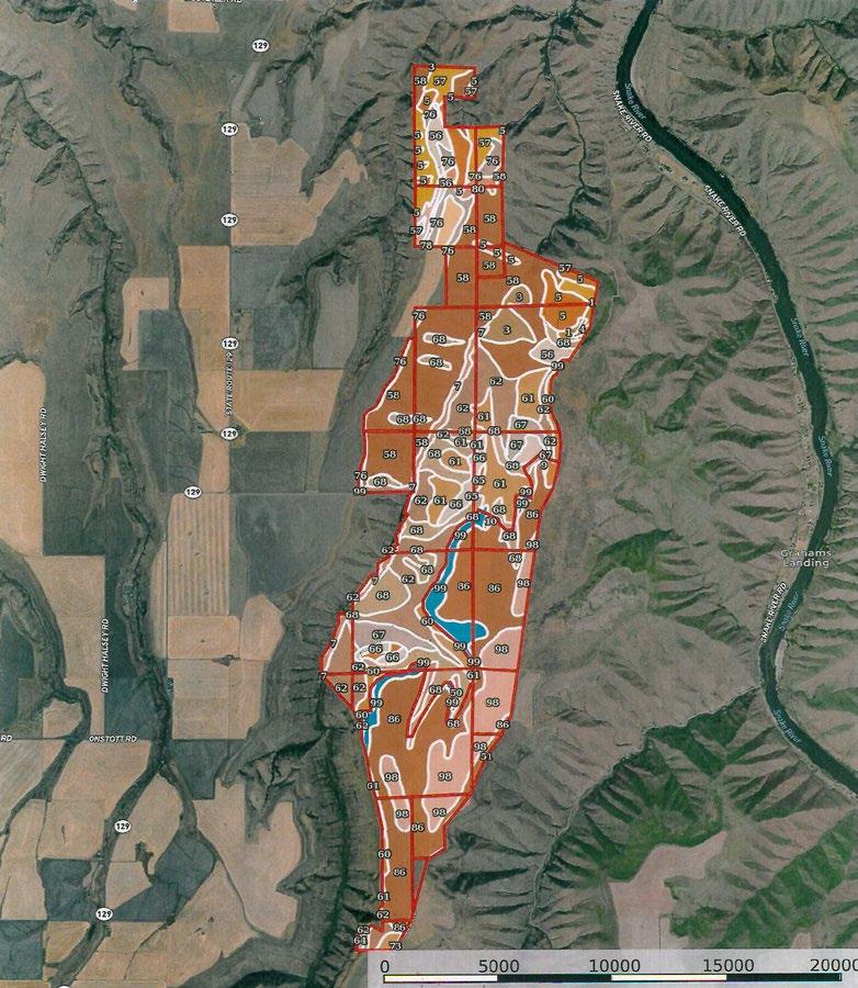The 4,889.69± acres is one irregularly-shaped tract of land, approximately 2.25 miles wide east to west and 7.25 miles north to south. The property is located on the north end of Weissenfel Ridge in Ten Mile Creek Canyon. There is a total of 4,889.69± FSA acres. There are 1,697.24± farmland acres, according to FSA records, and 3,292.46± acres of pastureland. The pastureland is fenced and cross-fenced.