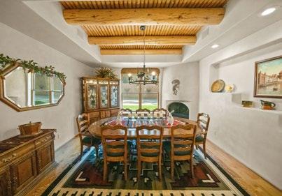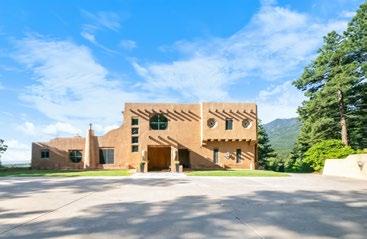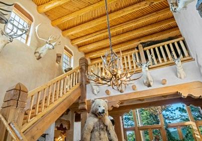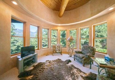 Handcrafted finishes include antler hardware, custom tile countertops by Summit Brick in Pueblo, copper-topped vigas, and custom doors built in Santa Fe. Light floods the home’s interior through three stories of floor-to-ceiling windows in the great room, while six fireplaces, a full indoor/outdoor sound system, and a wood/gas boiler system enhance comfort year-round. The walk-out basement adds a full wet bar, entertainment area, and hot tub access beside a wood-burning fireplace.