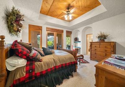 At the heart of the ranch is an 8,304± square-foot custom Santa Fe-style residence offering five spacious bedrooms and six bathrooms. Meticulously designed, the home balances luxury with warmth—every room features generous closet space and direct access to patios or decks. The primary suite includes a steam shower, private balcony, gas fireplace, and a generous 11’ x 15’ walk-in closet.