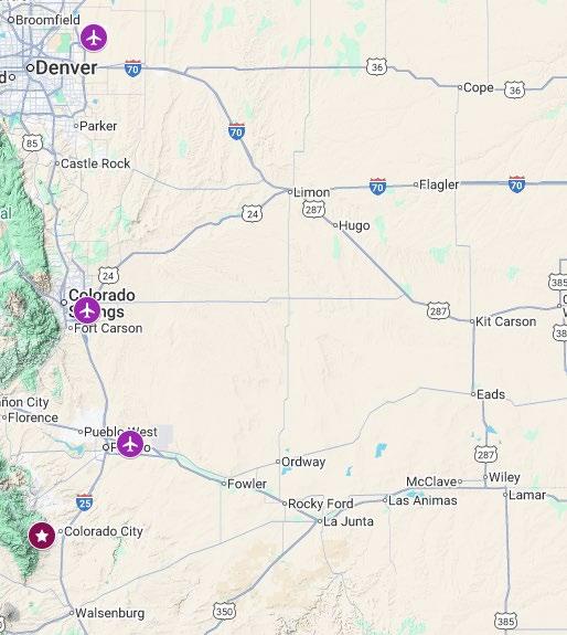 Bramaré Ranch is 45± minutes from the Pueblo Memorial Airport, which accommodates private jets and airplanes and offers a small selection of flights to Denver International Airport. It’s also 1.25± hours away from Colorado Springs Municipal Airport, which has more direct destinations and services.