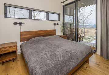 Complementing the main home is a 900± square-foot detached guest home designed by Intrinsik Architecture in Bozeman, Montana, and constructed in 2019. This thoughtfully designed mountain modern home offers one bedroom and one bathroom, with large west-facing sliding glass doors that open onto a deck, showcasing incredible views of the valley. The interior maximizes functionality and comfort, with a modern fireplace adding warmth and charm. The deck provides additional outdoor space, perfect for hosting guests or savoring quiet evenings with loved ones.