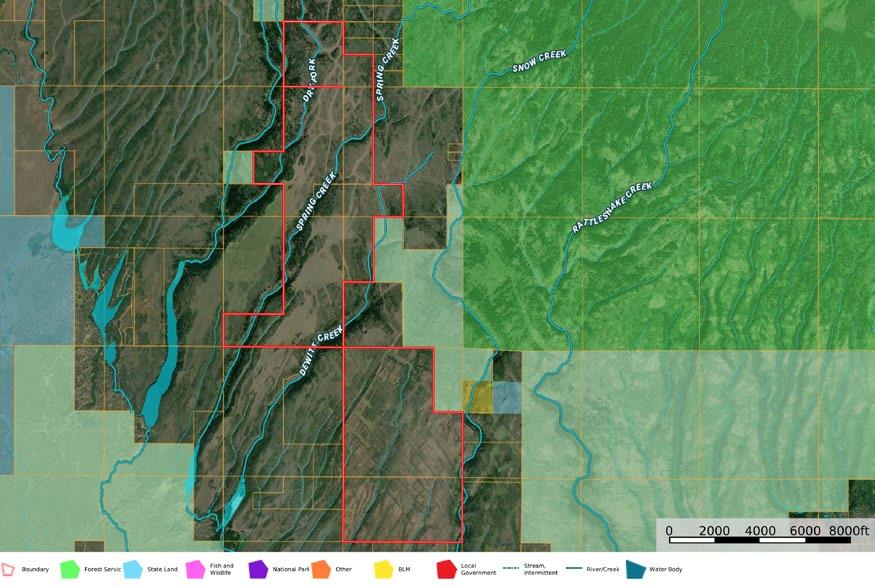 • Five named creeks flow through the property: Dry Fork, Spring Creek, Snow Creek, DeWitt Creek, and Cold Spring Creek