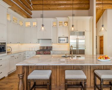 This contemporary log retreat utilizes 14-18” Canadian logs for a sleek yet natural design. Perched on a ridge, the home’s location provides commanding views of gorgeous meadows stretching to the mountainous horizon. This 7,303± square foot, six-bedroom, 3.5-bathroom ranch-style home blends coziness with grandeur, featuring recent renovations like French oak floors from Norway, quartzite kitchen counters, Dura-Supreme cabinetry, top-tier appliances, and custom exterior lighting. Upon entering the home, the foyer’s high ceilings and polished oak floors set the tone for elegance. You are drawn to the dual-sided river rock fireplace, which extends to the ceiling and separates the formal dining area from the cozy library. The great room features plush seating, large windows, a second rock fireplace, and sliding glass doors opening to a new wrap-around deck overlooking the tree-lined meadows and mountain vistas. The dining area and kitchen complete the great room, making the space perfect for entertaining. The kitchen is very functional and welcoming, with ample storage and an island with a sink, a dishwasher, and a cozy bar seating area.