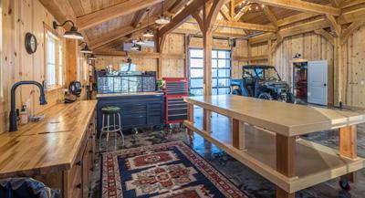 The new 1,457± square foot Amish-constructed timber-framed barn includes 10’x10’ glass and sliding doors, Wi-Fi, A/C, and heat. The barn’s glass doors and exterior lighting are connected to Wi-Fi and can be controlled via an app. A 30-amp 220 outlet is at the back of the barn for an RV to hook into.