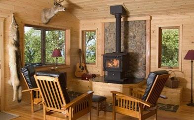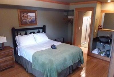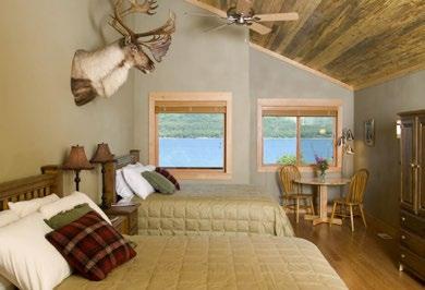 • The sleeping lodge has six private rooms with four baths. The seventh room is a suite with two queen beds, a fireplace, and a private bath