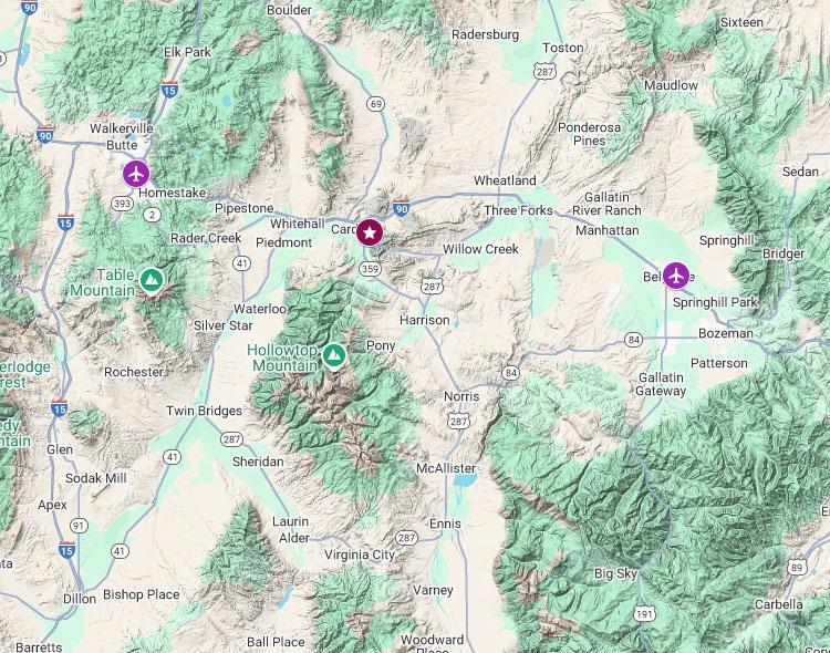 The Bert Mooney Airport in Butte is a short 30 minute drive and features a newly constructed terminal and commercial flights on Delta to Salt Lake City for travel ease and convenience from a small, visitor-friendly Western Montana Airport. Butte Aviation offers full service FBO at Bert Mooney to cater to the needs of private aircraft visiting the area. Forty minutes away, Bozeman Yellowstone International Airport, serviced by many daily flights from Delta, United, American, Alaska, Allegiant, Avello, Frontier, Jet Blue, Southwest, Sun Country, and Jet Suite, flies to destinations around the country. Plus, the Yellowstone Jet Center is well equipped and caters to private and corporate aircraft.