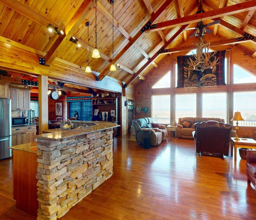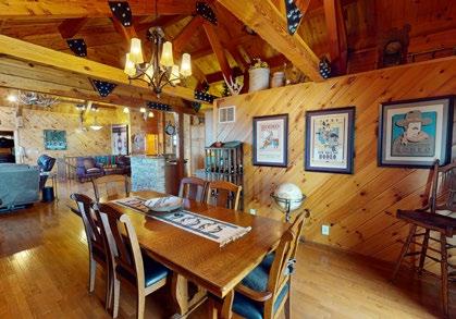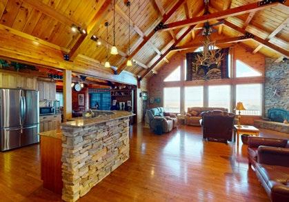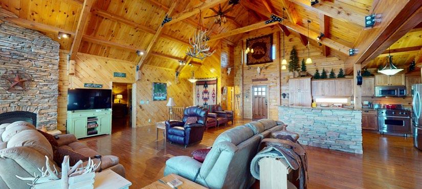This magnificent log home was constructed in 2005 and offers a total living area of 3,640± square feet. It features three bedrooms with walk-in closets and four bathrooms, providing ample space for guests and entertainment. The main living room includes a gorgeous fireplace with breathtaking views of the valley and a beautiful wrap-around porch. Granite countertops, a walk-in pantry, and top-of-theline appliances complement the spacious, well-lit kitchen. The home also features lovely doublepane windows and impressive vaulted ceilings. An exceptional geothermic system provides efficient cooling and heating.