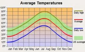 Fort Laramie is in the warmest part of Wyoming. During the summer, temperatures can soar to over 100 degrees Fahrenheit, with average temperatures ranging from the 80s to 90s. However, the nights are generally cool. The area is semi-arid, experiencing a distinct dry season in winter. Approximately 70% of the annual precipitation occurs in the spring and early summer. Climate charts courtesy of https://www.city-data.com/city/Fort-Laramie-Wyoming.html