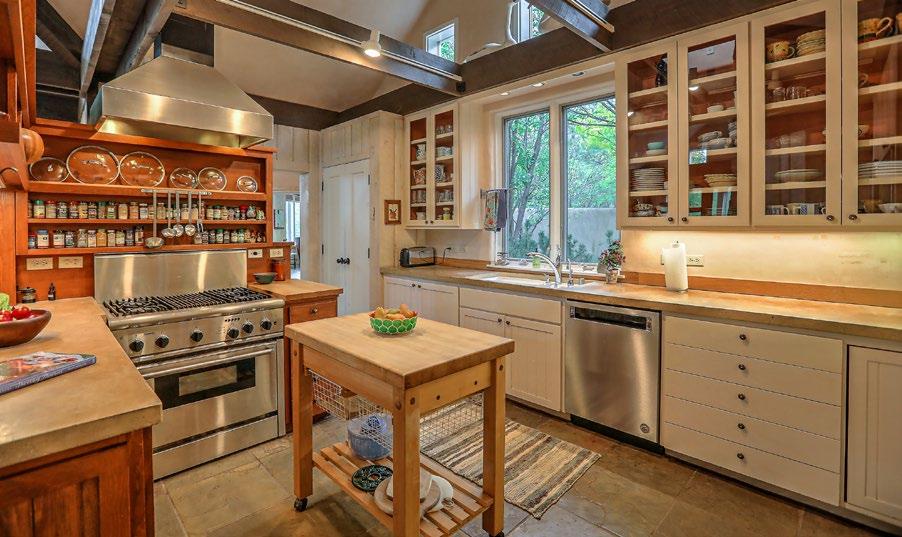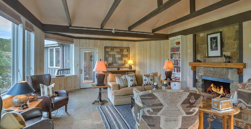A stunning 2,500-square-foot owner’s residence is perched on the edge of the Pecos River, complete with a generous-sized sleeping porch. The three-bedroom, three-and-a-half-bath home has two living areas with four fireplaces and two wood-burning stoves. The kitchen is open and perfect for entertaining. The house includes hard plaster and wood plank walls, in-floor radiant heat with slate tile, concrete countertops, and high-quality appliances.