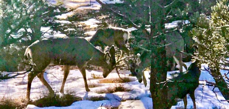 A series of springs and seeps provide drinking water for the numerous mule deer and elk. Black bears peacefully wander the ranch. Wild turkeys, quail, foxes, and beavers are abundant. Coyotes harmonize in the hills at night, and blue herons stalk the waters in the evening. Red-tailed hawks nest on the property, and bald eagles are frequent visitors.