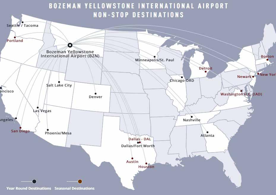 The Bozeman Yellowstone International Airport is located 23± miles east of Madison Bend Ranch and is an easy 25-minute drive from the property. Delta, United, American, Southwest, Allegiant, Alaska, JetBlue, and SunCountry airlines provide service to Bozeman Yellowstone International.