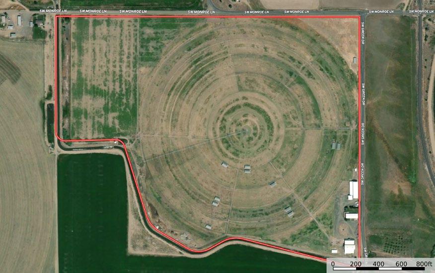The parcel has an elevation of 2,850± to 2,870±, with the lowest point towards Green Drive and the highest towards the center of the pivot. The soils are Madras sandy loam, typical for the area. They provide excellent drainage for forage and have an excellent track record of climate for seed crops.