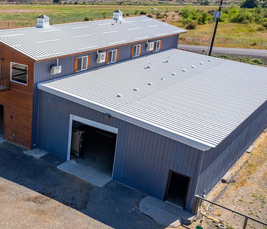 The Mountain View Livestock Farm home is a steel frame structure with metal siding and roof for low maintenance. The three-bedroom and three-bath home is framed inside with drywall and an open layout. The windows from the large great room/ kitchen open to the fields and mountains. There is a spacious garage and extra storage room for most domestic needs.