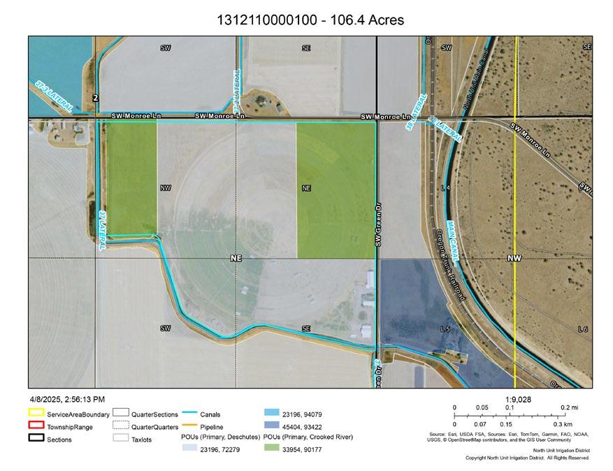Mountain View Livestock Farm has 106.4± acres of water rights serviced through the North Unit Irrigation District (NUID). Of those water rights, 70.5 acres are Deschutes Water Rights, and 35.9 acres are Crooked River water rights. In 2025, NUID is planning on delivering 2 acre-feet for Deschutes rights and 1 acre-foot for Crooked River rights. Assessment charges for the delivery of the water through the district are $9,200.47 in 2025. For more information about NUID, please visit their website at https://www.northunitid.com.