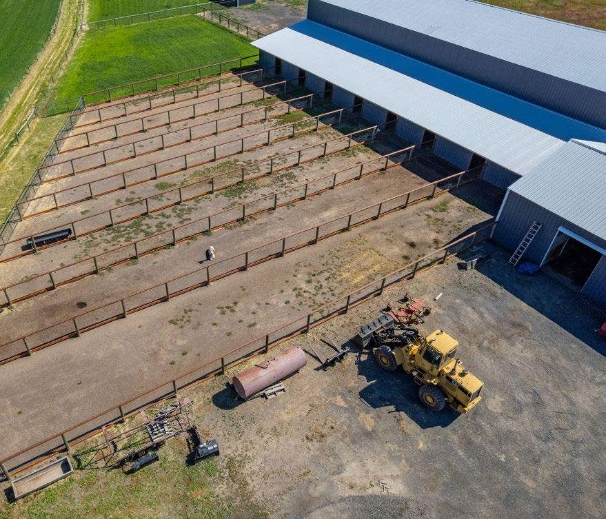 The hay barn is 40’ x 140’ and has siding on two sides. It can hold 400± tons, depending on hay density. Off the west side of the hay barn is a wing that includes 8 animal stalls with pipe frame and steel hog panel sides. All stalls have openings for the animals to stretch their legs.