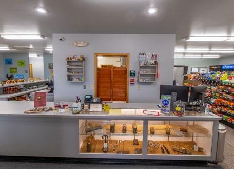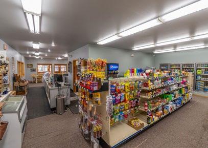 The store offers 600+ square feet of retail space for essential food items, toiletries, drinks (including beer and wine), and souvenirs. It also includes four 4-door coolers, three free-standing drink coolers, and a fountain drink dispenser.