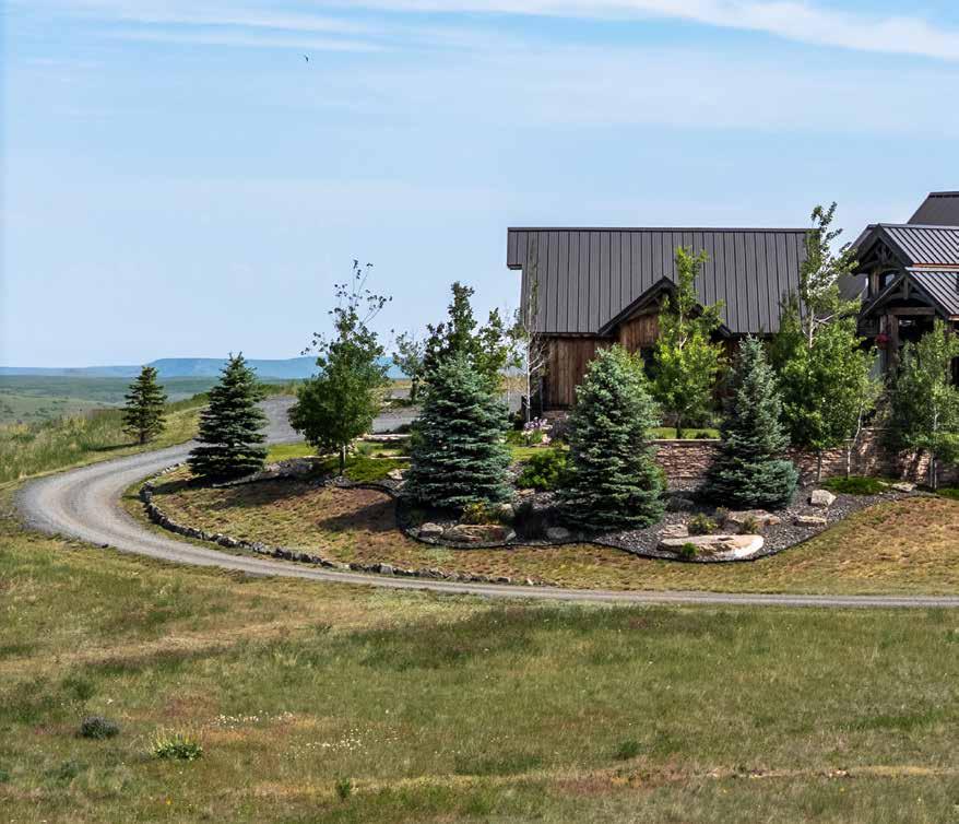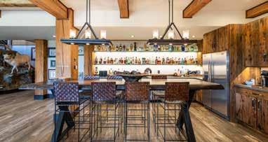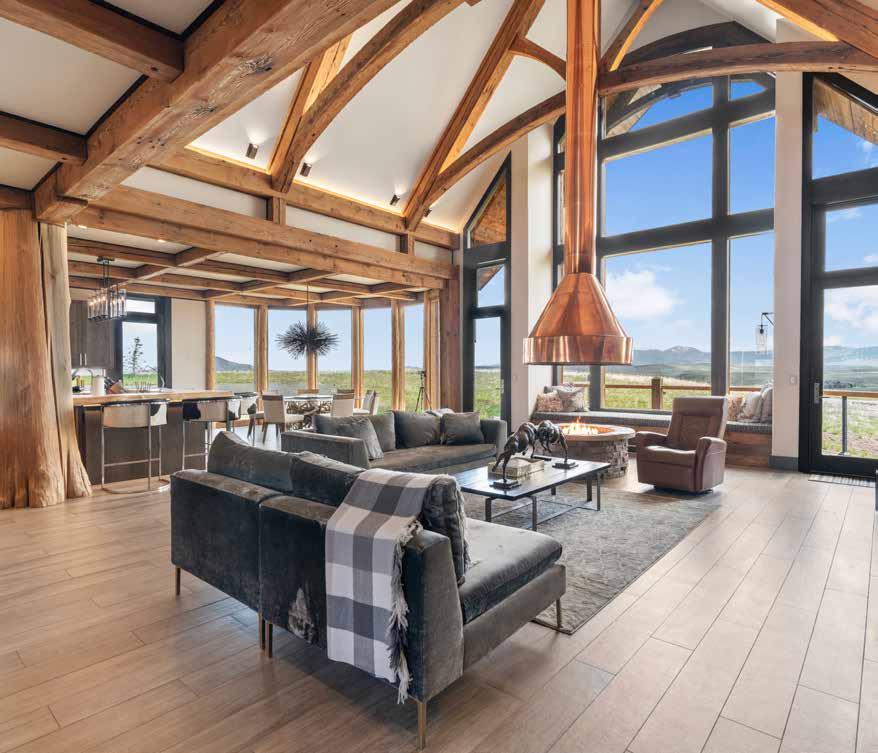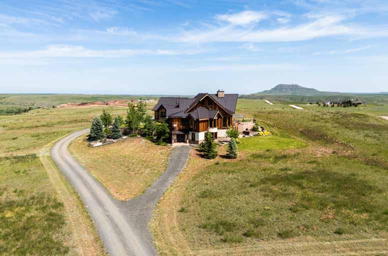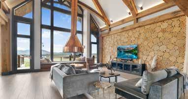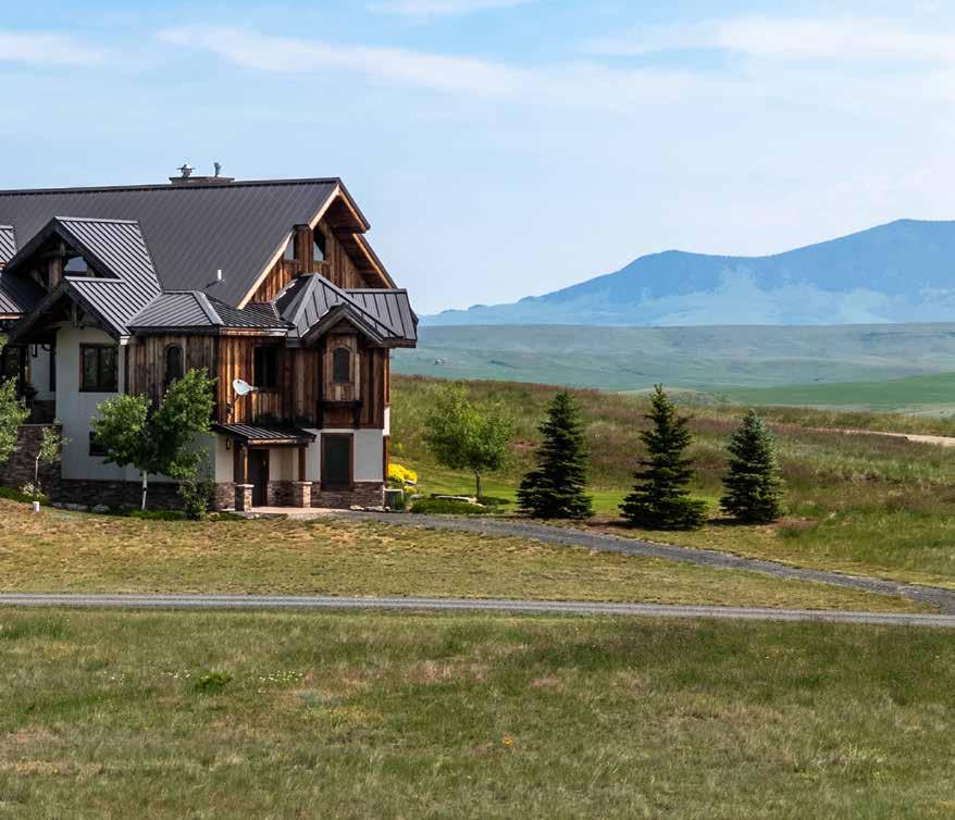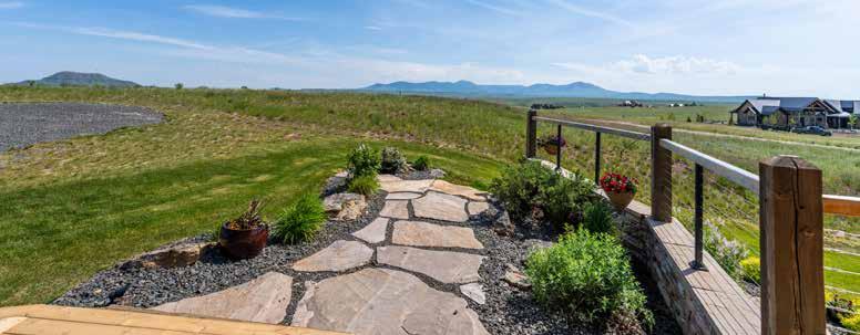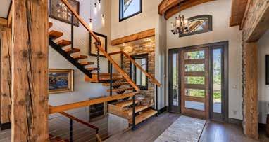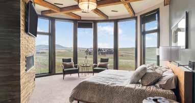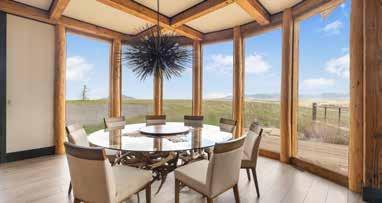 The home is a beautiful fusion of rustic Montana charm and modern design. With five bedrooms and a spacious upperlevel bonus area, it provides ample space for family and guests. At the heart of the home is the Great Room, featuring a circular gas fireplace, wine-tasting nook, and a striking wood accent wall—all surrounded by sweeping 360-degree views. The main-level primary suite offers a luxurious retreat with dual closets, while two more bedrooms are located on the main floor and two additional ones on the lower level. Downstairs, a large family room with a game area, wet bar, and walk-out patio with hot tub creates the perfect space for entertaining or relaxing.