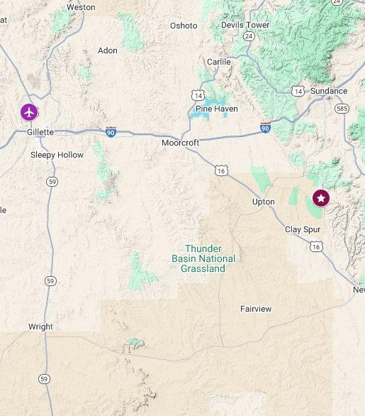 Two cities provide commercial air service to the ranch. Campbell County Airport, located in Gillette, Wyoming, 60± miles northwest, provides daily commercial flights. Rapid City Regional Airport, about 110 miles east, is a larger airport with more daily options.