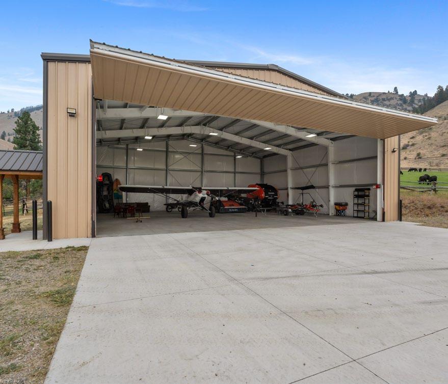 Infrastructure reflects a working ranch operation with aviation capabilities and is further diversified with the onsite motocross track. The 2,600± foot professionally engineered airstrip features a 5-degree uphill approach, 1,000± feet of level runway, and 5-degree departure slope, optimized for canyon wind patterns accommodating backcountrycapable aircraft including Cessna 206, Kodiak, and Caravan models. The 2019 Schweiss hangar spans 60’ x 50’ with insulated construction, concrete floors, and 19-foot clearance doors powered by a 14kW Kohler generator with solar backup.
