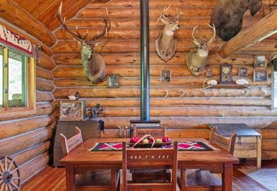 Follow a private drive for about a quarter mile to reach the 2,138± SF, three-bedroom, two-bathroom custom log home with an oversized one-car garage and barn with a tall door and covered car/tractor port.