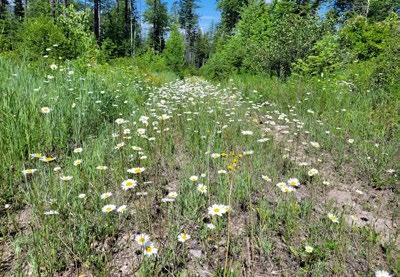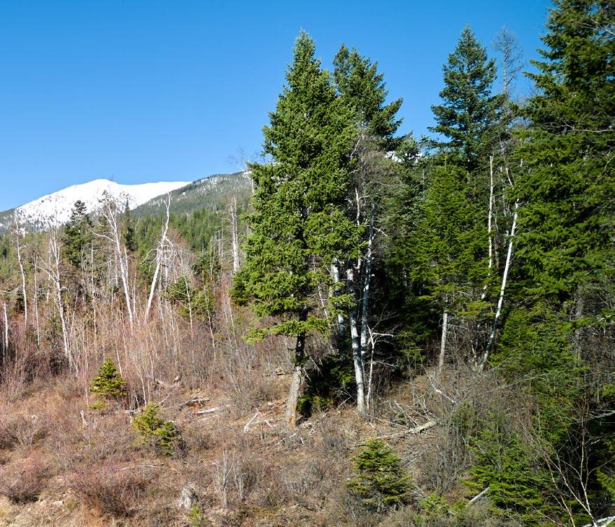 The terrain is a diverse array of vegetation, including tamarack, spruce, fir, and aspen groves, interspersed with patches of willow, beargrass, Oregon grape, and fern covering the forest floor. Strategic tree removal could further optimize the panoramic vistas.