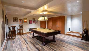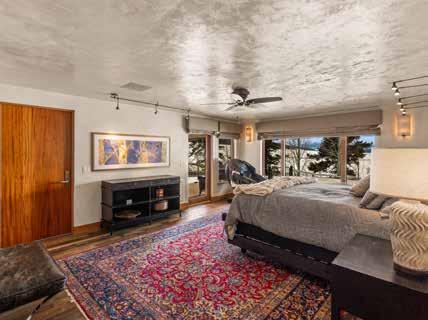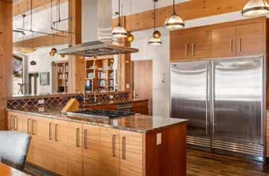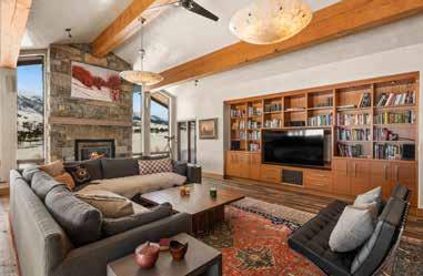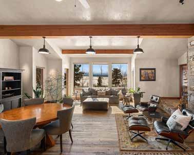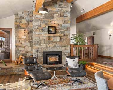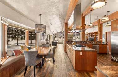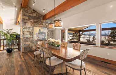 Reclaimed oak floors lead you across the main floor to a large dining area and the light-filled kitchen with a dining nook looking out into the trees. Elegantly styled, the chef’s kitchen features a large island, stainless steel appliances, and stone countertops. Vaulted ceilings throughout the home open the space up. Rocky Mountain Hardwood doors and cabinets lend to the charm. The kitchen overlooks a second living area with a second floor-to-ceiling stone fireplace flanked by large windows and built-in bookshelves.