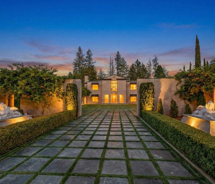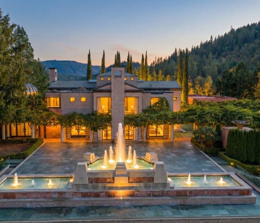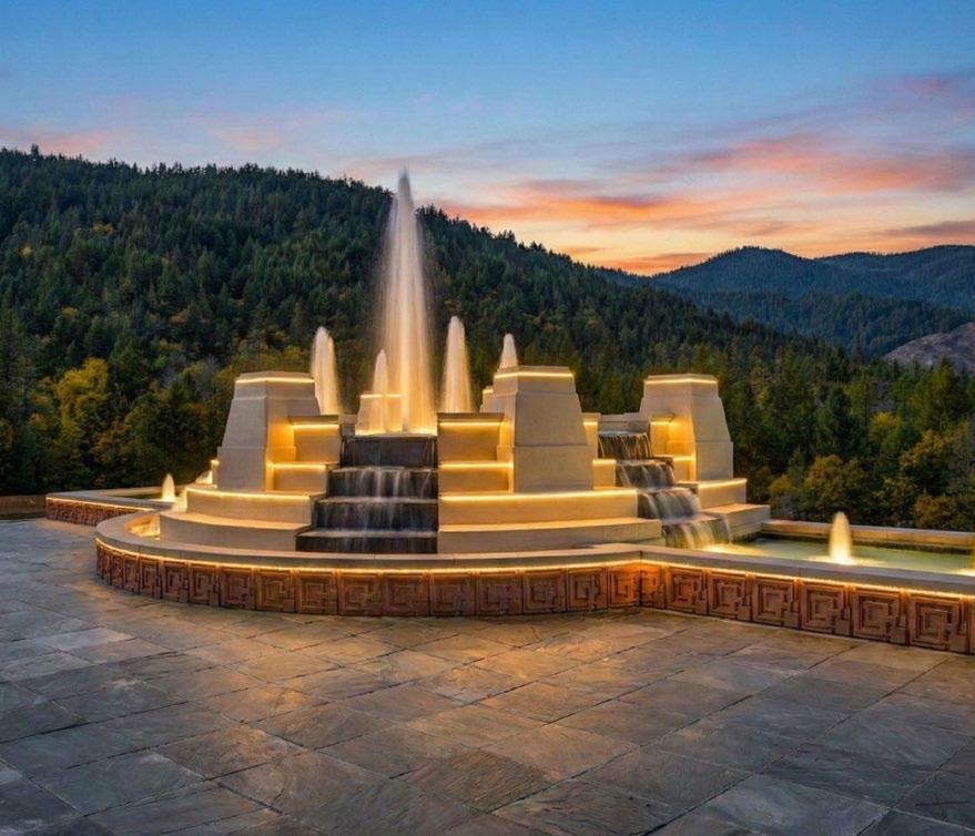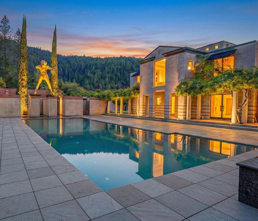 Additional standout features include a multi-tiered amphitheater with an integrated water feature, expansive outdoor entertaining terraces, and an Olympic-sized pool area with a concealed speakeasy bar and private theater, creating a resort-style environment rarely found in private ownership. A vineyard further enhances both the visual appeal and potential utility of the land.