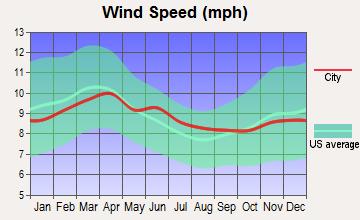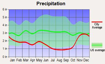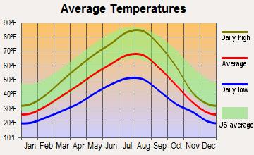 Experiences a dry-summer climate, with hot, dry summers and cool, snowy winters. Average summer highs reach the mid80s °F, while winter lows often drop below freezing, with occasional heavy snowfall.