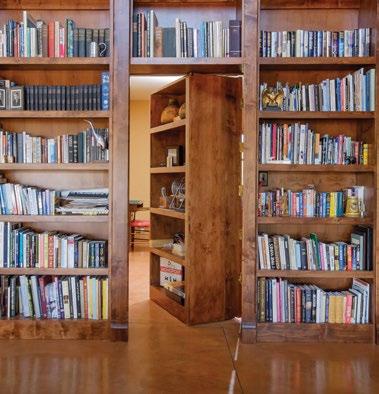 Approximately 40’ vaulted ceilings in the great room are complimented with rough-cut fir beams and metal rods with “tie downs” that hold it all together. Two matching dry-stacked fireplaces on each end of the great room give a warm feeling to the area. The south side of this room is comprised of five folding glass doors which reveal incredible mountain views. This gorgeous sight remains unobstructed from the front of the home all the way through to the back. An 11-foot-tall bookshelf with a rolling ladder runs along the opposite end of the living area with a 2-foot thick hidden door that enters the office.