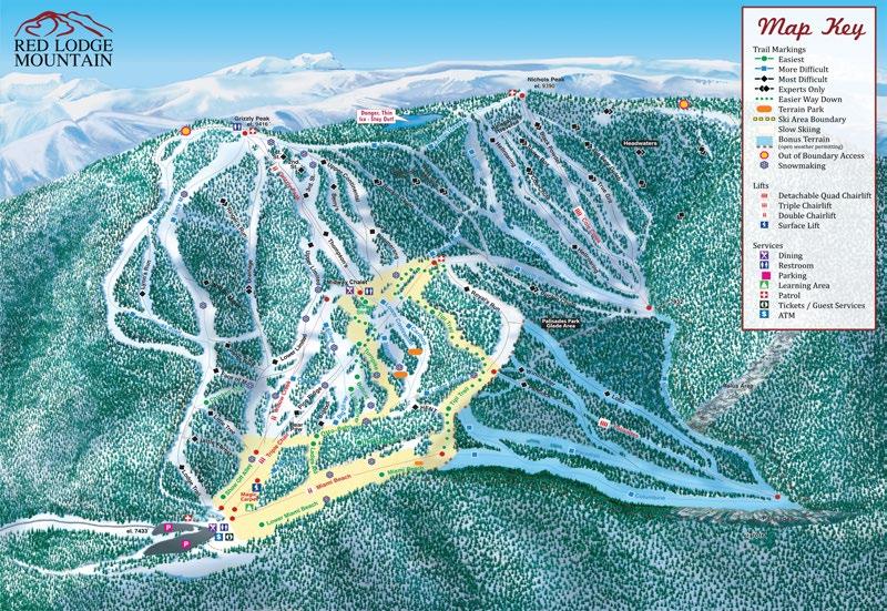 Skiing Red Lodge Mountain, 25± miles, is a very popular pastime in the winter months and attracts many skiers from Montana, Wyoming, and the Dakotas, along with folks who have heard of the “Hidden Gem” from around the country. Red Lodge Ski Mountain has a base elevation of 7,016’ and a summit elevation of 9,416’, which offers a beautiful view of the surrounding mountains and the area below, all the way to Wyoming. Six chair lifts and one surface lift shuttle skiers up the mountain with minimal lines and can service a capacity of 10,690 skiers per hour.
