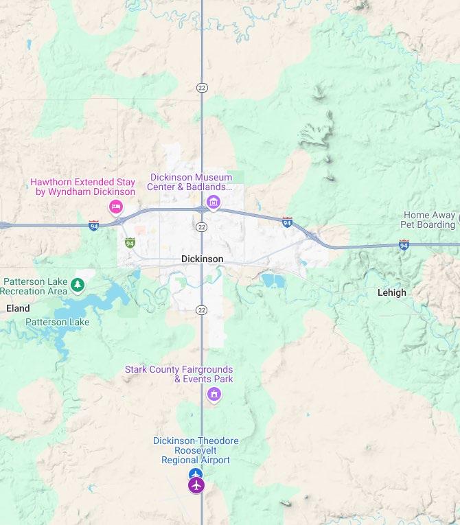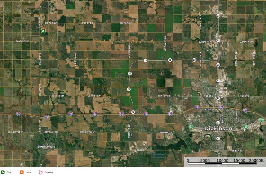 For those driving from the property, the town of South Heart is about two miles south of Interstate 94, and about 10 minutes total from the house. Dickinson, the closest city with a population of about 25,000+ is about a 20 minute drive, east on I-94.